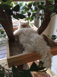 ![]() | I am beyond happy with my new cat tree house! This is such a beautiful, unique piece and is now the focal point of my living room, certainly a conversation piece. The craftsmanship was impeccable, and I consider it a fine piece of furniture in my room. The cats immediately loved it, the bold ones trying out every shelf, while the shy ones gathered at the bottom sniffing and watching the others. Soon, they were all on it, vying for positions - I may have to consider adding another one!While the shipping/setup was not perfect, I really appreciate your quick response to get everyone back to set it up with the white glove delivery. I'm so glad I purchased this, as it was a very heavy piece and all went well bringing it in the house, upstairs, and positioning it like I wanted. You a truly unique artists! I have shared your brochure with all my friends and fellow volunteers at the Peter Zippi Fund for Animals (no-kill cat rescue organization), all of whom have several cats like me. Many of them are coming over to my house to see my new addition. Thank you again for a very satisfying experience and a beautiful functional piece of art! Diane Lotzer ![]() Date of Posting: 29 June 2015 Posted By: Diane Redondo Beach, CA |